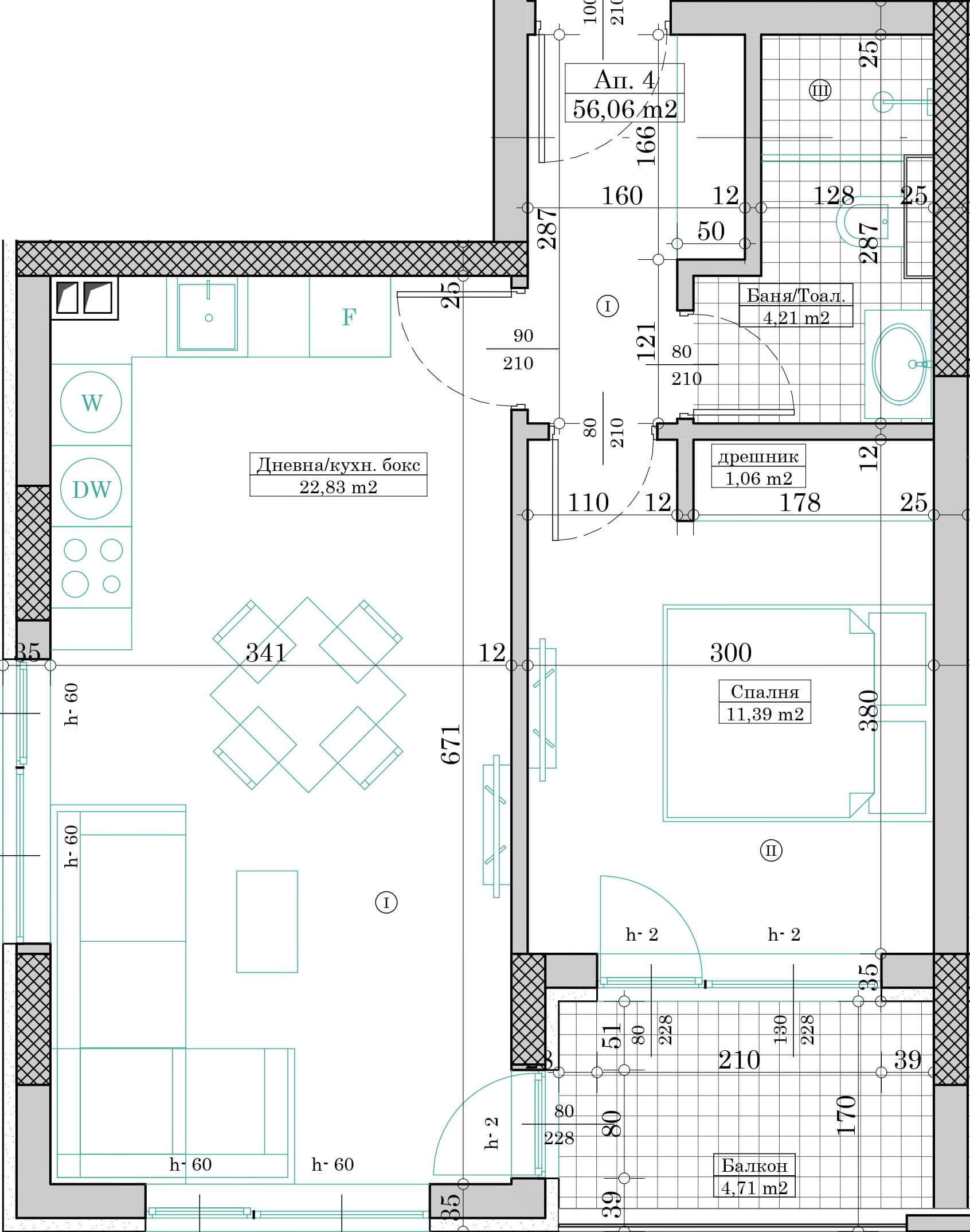 Апартамент №4 се състои от дневна с кухненски бокс, спалня, баня с тоалетна, дрешник, коридор и балкон.