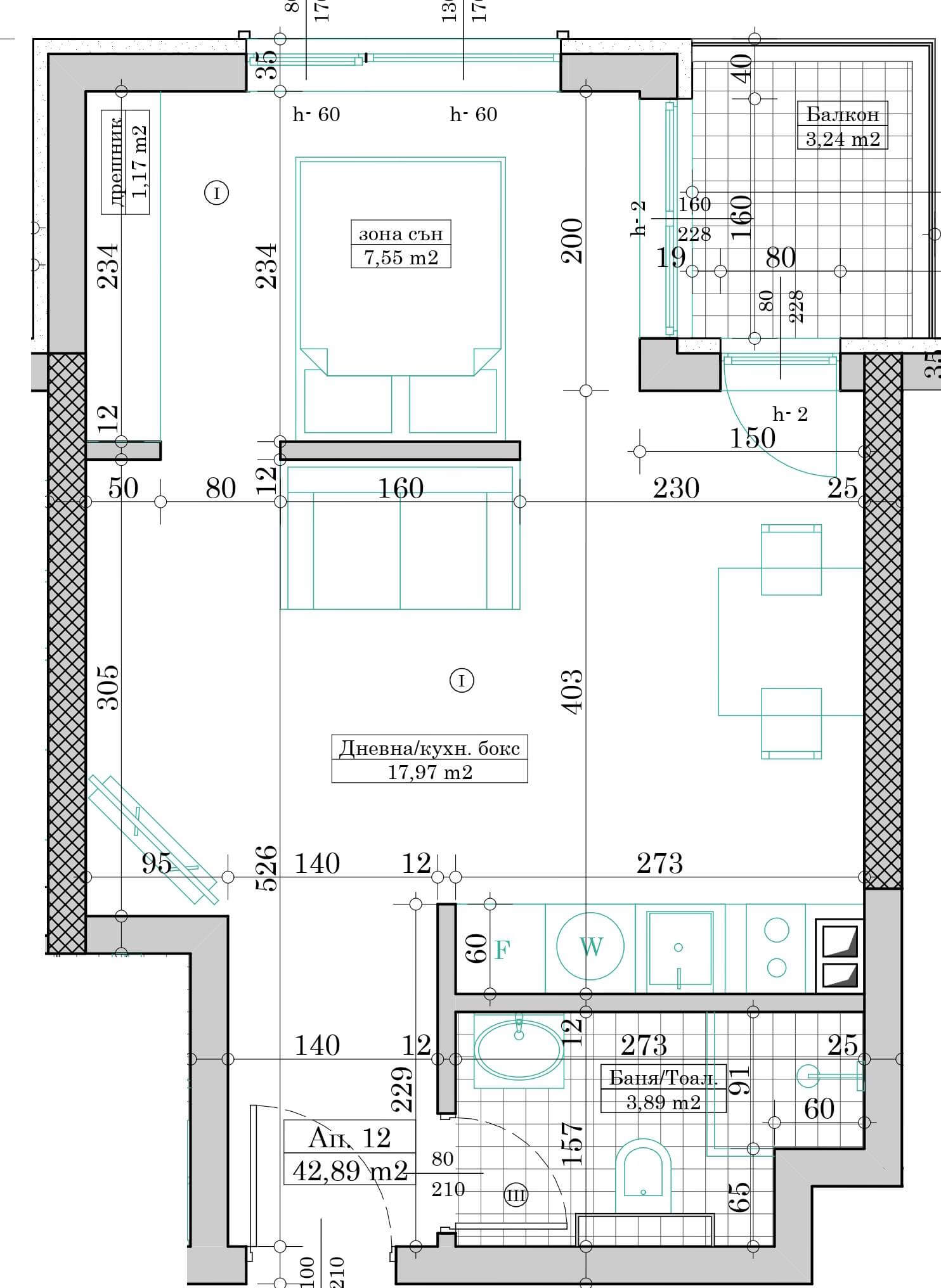 Апартамент №12 се състои от дневна с кухненски бокс, зона сън, баня с тоалетна, дрешник, коридор и балкон.