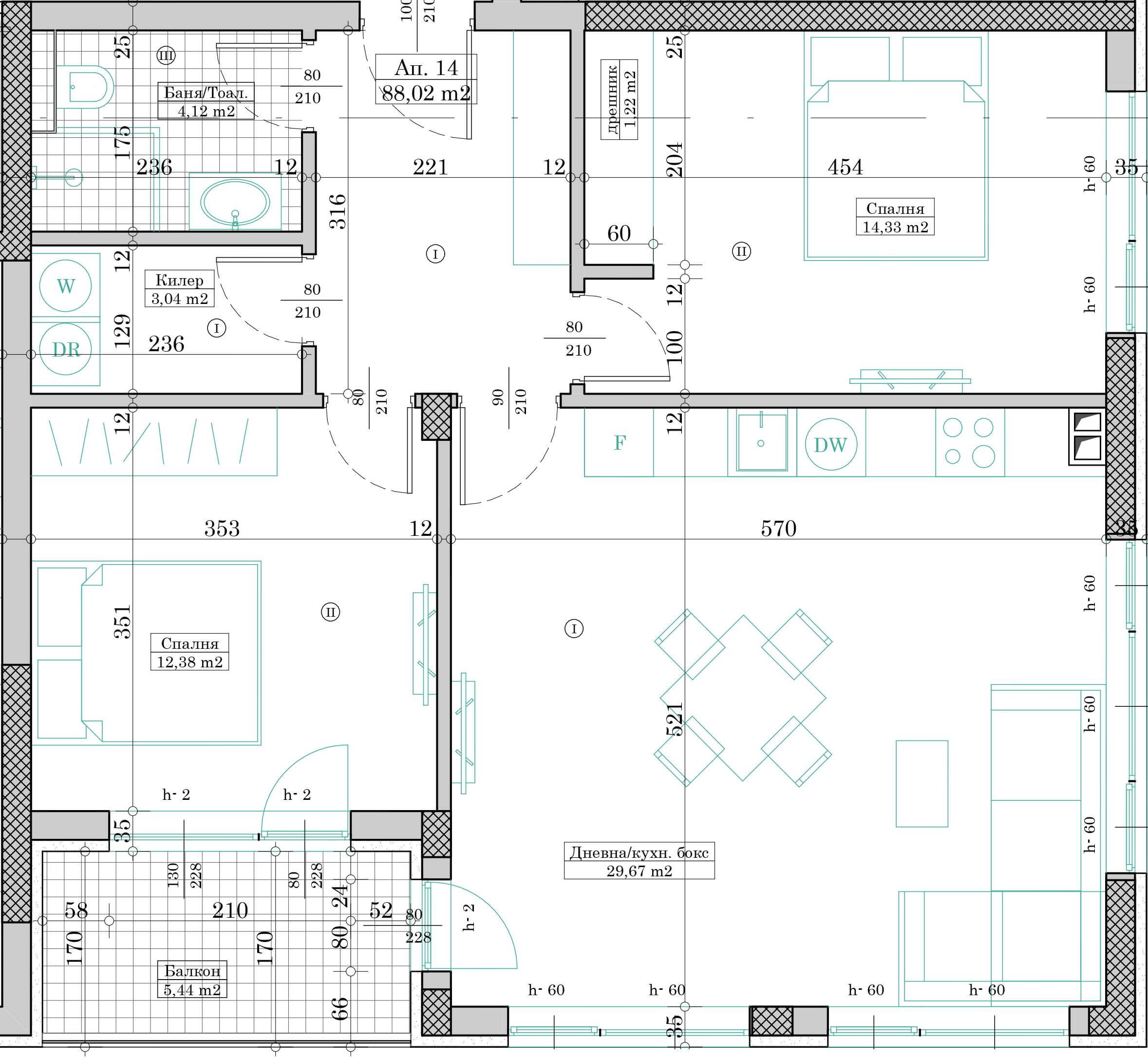Апартамент №14 се състои от дневна с кухненски бокс, две спални, баня с тоалетна, дрешник, килер, коридор и балкон.