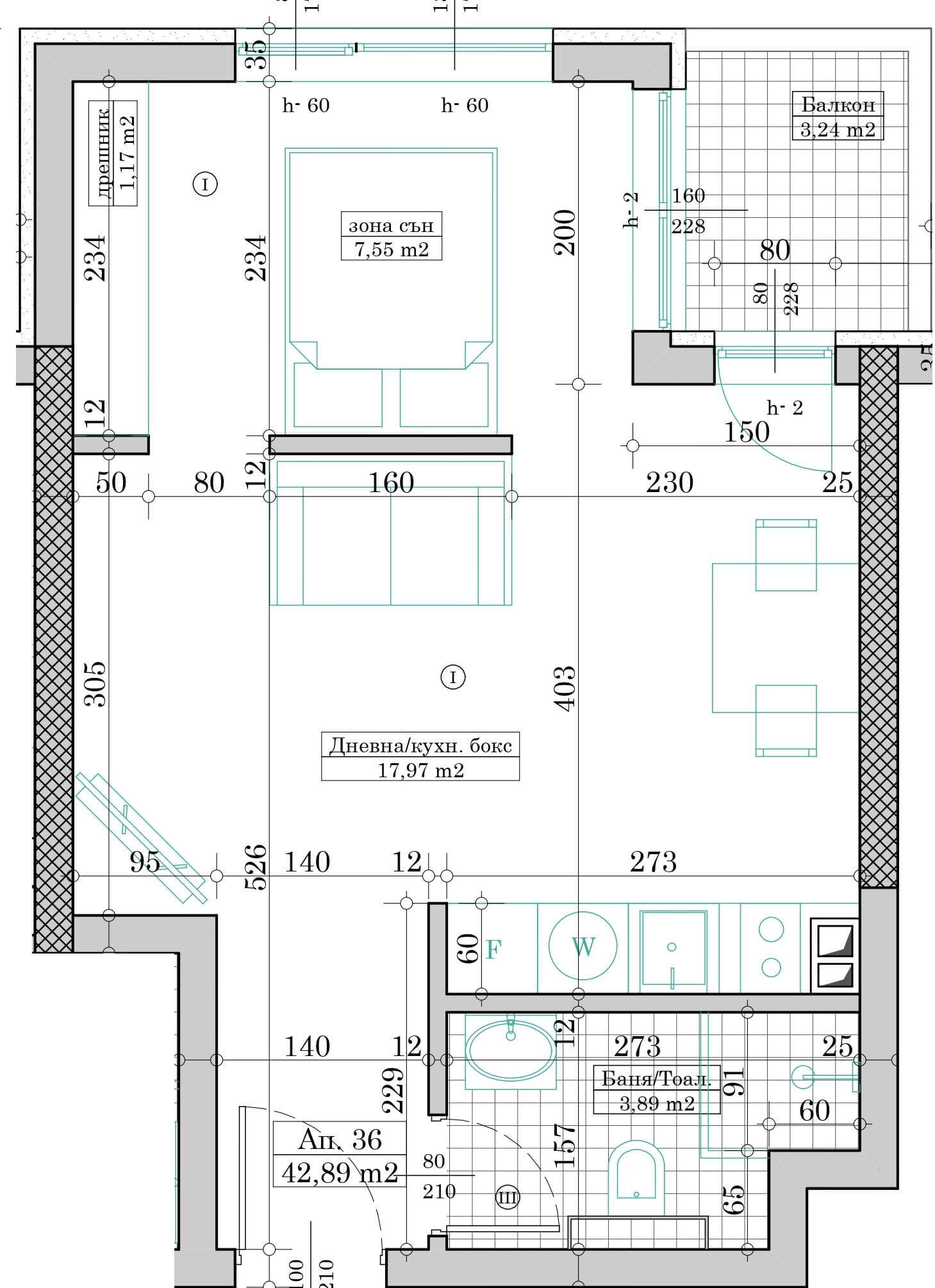 Апартамент №36 се състои от дневна с кухненски бокс, зона сън, баня с тоалетна, дрешник, коридор и балкон.
